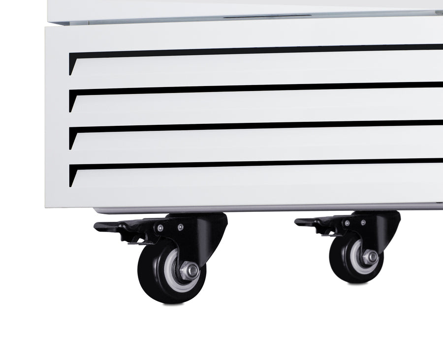 The AFS14PVDL2B comes in a white exterior finish with a blue accented control panel. The factory-installed antimicrobial handle is powder-coated with naturally occurring silver ions, which help to reduce the spread of germs, allowing for a safer, cleaner user experience. This model includes a factory-installed lock and ships with two keys for staff use. Powerful magnetic gaskets ensure a positive seal. Four pre-installed 4" high casters with brakes make it easier to move as needed.