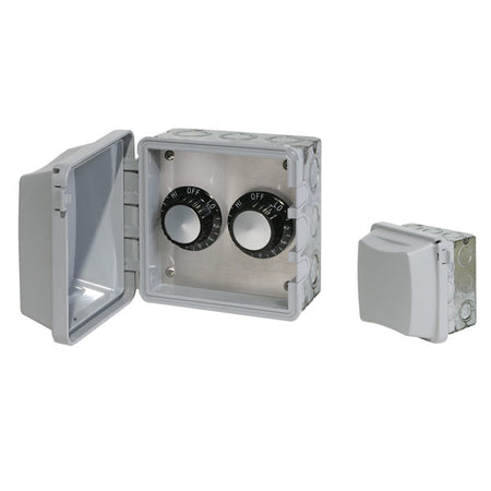 Dual INF in wall heat control assemblies with weatherproof covers for exposed exterior locations. For 120-volt applications must use item #14-4115. For 240-volt applications must use #14-4215. Includes gang box, stainless steel faceplate, and weatherproof front cover.