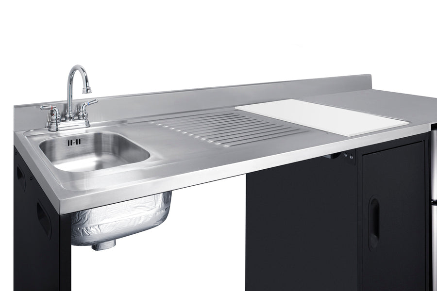 Located on the left side of the CK72ADALBFNCK is the stainless steel sink, complete with a gooseneck faucet. Next to the sink is a stainless steel counter area for food prep. The surface includes a small cutlery bin, with a removable cutting board cover to ensure easy food prep. In the middle of the unit are two single-door cabinets that include removable wire shelves, perfect for storing cleaning supplies.