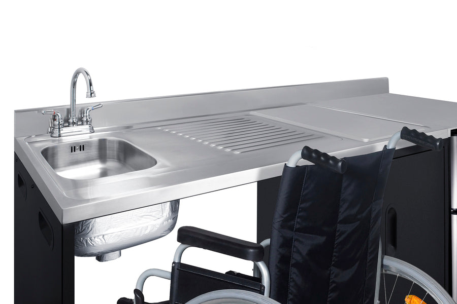 The CK72ADALBFNCK is a 72" wide all-in-one compact kitchenette with a 34" ADA-compliant counter height and a barrier-free design for added wheelchair accessibility. It has a 31.88" wide open area under the sink to ensure adequate space for wheelchairs. This unit is designed, but not limited to, users with mobility impairments, such as those who use wheelchairs, users who are temporarily impaired, or recovering from a procedure, and can benefit from increased accessibility and enhanced ease of use when accessing the unit’s sink, food prep area, and storage cabinet.