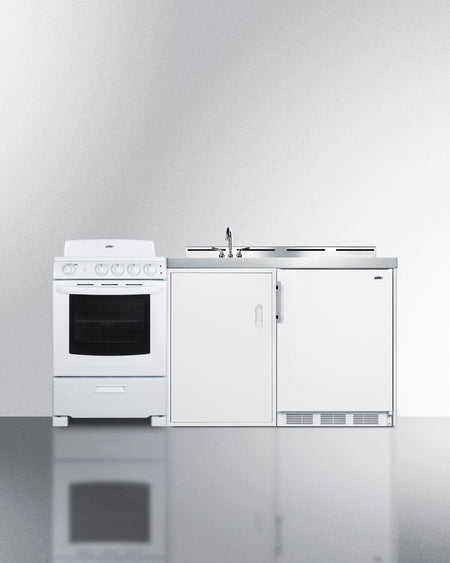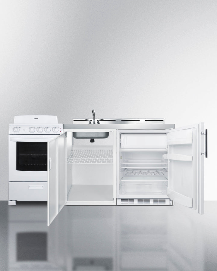 Summit's line of all-in-one combination kitchenettes brings complete kitchen convenience in a slim-fitting design. These units come fully featured with everything you need for the home foodservice experience, including a refrigerator with a freezer compartment, 4-element electric coil cooktop with oven, sink with faucet, cutlery bin with a removable cutting board cover, and storage cabinet for dry goods.