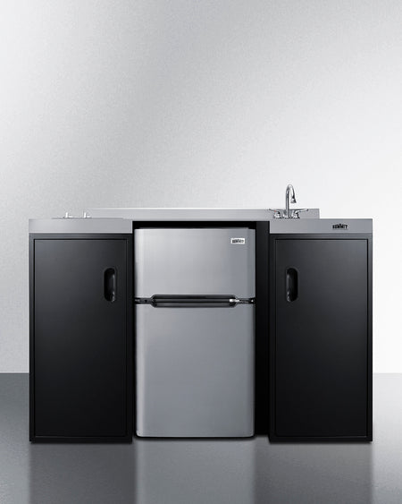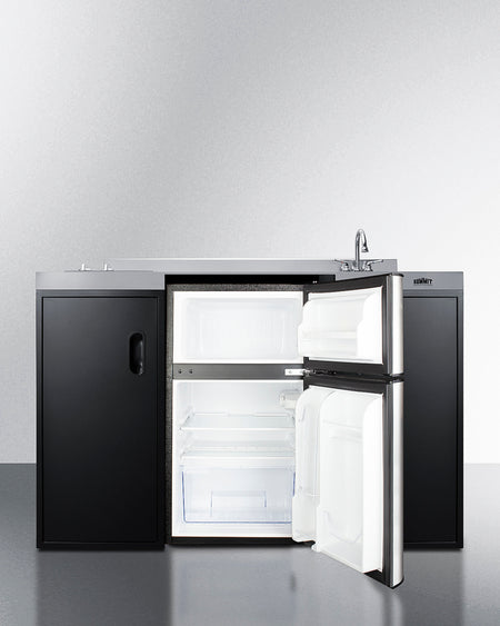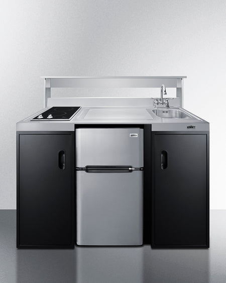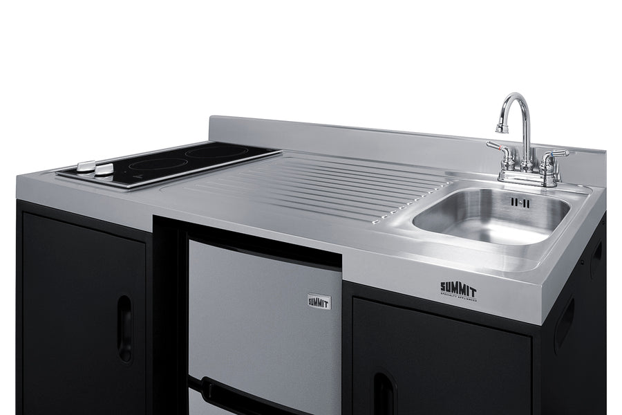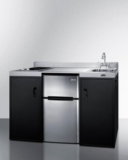 The CK55ADASINKR is 54" wide in an easy-fitting 24" depth. The counter is sized at 34" high to comply with ADA guidelines for user accessibility. Its black exterior brings a modern look to efficiency spaces, with added touches of stainless steel on the kitchenette work surface and refrigerator doors. This unit includes a built-in 115V smooth-top cooktop with a rear 7" 900W and a front 5½" 500W heating element. The power cord comes pre-installed for easy setup. The left side of the kitchenette features a compact sink with ready-to-use faucet. A single-door cabinet under the sink includes a removable wire shelf, perfect for storing cleaning supplies, while a French-door style cabinet under the work surface has a solid removable shelf, ideal for dry storage. Two grooved handles on each side allow for easy movement of the unit.