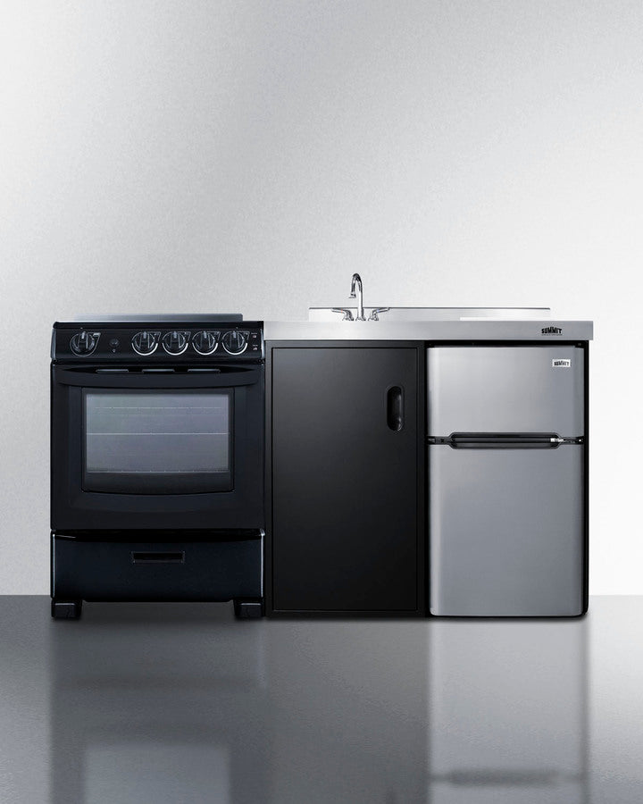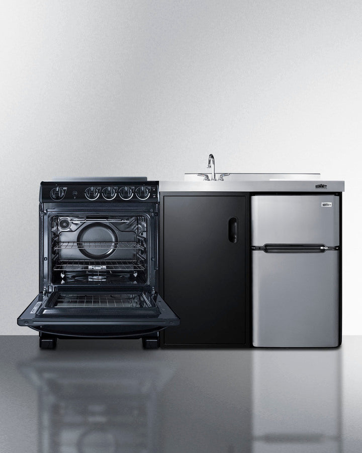 Summit's line of all-in-one combination kitchenettes brings complete kitchen convenience in a slim-fitting design. These units come fully featured with everything you need for the home foodservice experience, including a refrigerator with a freezer compartment, 4-burner smooth top range with oven, sink with faucet, cutlery bin with a removable cutting board cover, and storage cabinet for dry goods.