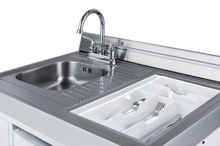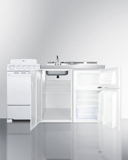 Summit's line of all-in-one combination kitchenettes brings complete kitchen convenience in a slim-fitting design. These units come fully featured with everything you need for the home foodservice experience, including a refrigerator with a freezer compartment, 4-element electric coil cooktop with oven, sink with faucet, cutlery bin with a removable cutting board cover, and storage cabinet for dry goods.