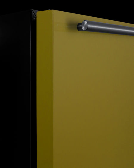Model BRF631BKYADA is a 24" wide refrigerator-freezer sized at just 32" high for use in ADA compliant settings, with a generous capacity of more than 5 cu.ft. to meet general storage needs. The door comes in a bright saffron gold hue, with a sleek horizontally mounted stainless steel handle and matching stainless steel kickplate to complete the unique look. This unit has a jet black exterior cabinet. It is manufactured in Europe and modified in the United States with domestic steel finishing.