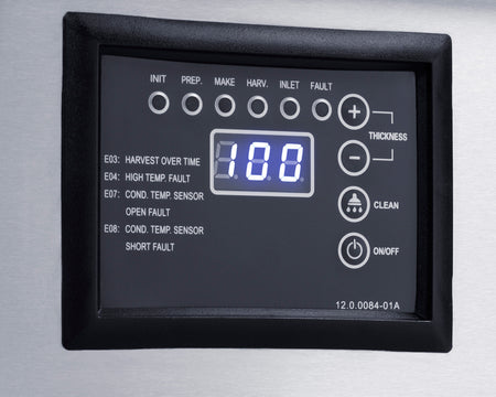 Inside, the BIM125 produces up to 120 lbs. of clear, cube-style ice cubes daily. The interior can store up to 40 lbs. to help meet the needs of high-traffic commercial environments. All digital controls are conveniently located in front, including a function to adjust the thickness of each ice cube. This unit also has a water filter and a removable mesh filter at the rear to ensure easier condenser maintenance. This automatic ice machine features a clean function, a full bin sensor, attractive LED lighting, and an ice scoop to maximize convenience.