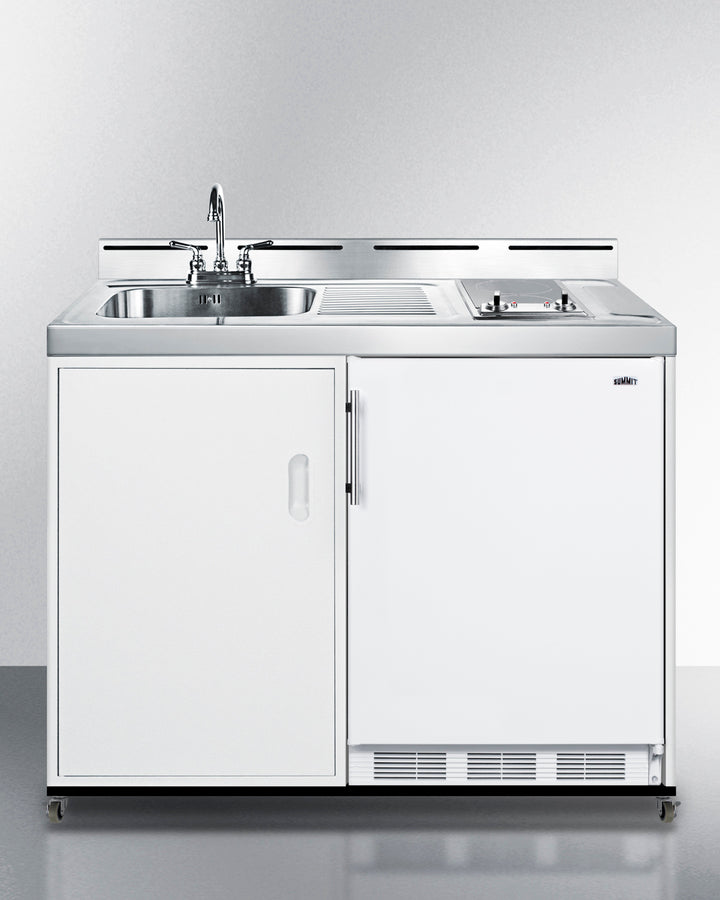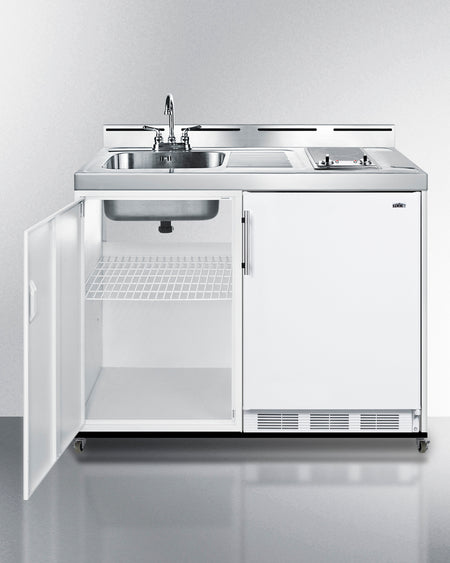 Summit C48ELGLASSPUMPMB 48″ Wide Mobile All-in-One Kitchenette with 5.1 cu ft Refrigerator/Freezer, 2-Burner Smooth-Top Cooktop, Sink & No-Plumbing Pump Kit – White Cabinet