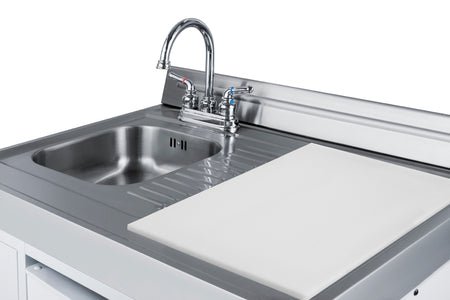 The ACK60ELSTW is a 60" wide kitchenette with an easy-fitting 24" depth. This unit comes with a stainless steel countertop offering durability in a professional look. The surface includes a small cutlery bin, with a removable cutting board cover to ensure easy food prep. The compact sink features a ready-to-use faucet. Underneath the sink is a large cabinet with a removable shelf for added storage convenience.