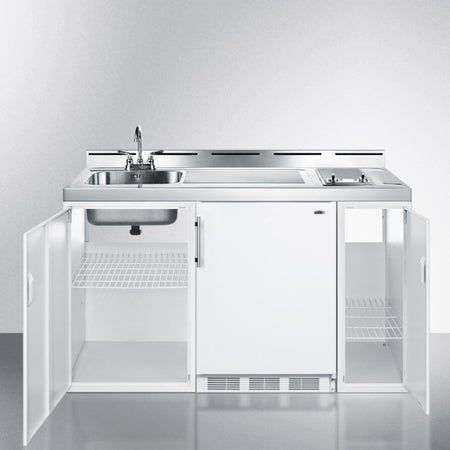 Summit C60ELGLASS 60″ Wide All-in-One Kitchenette – White Finish, Smooth-Top Glass Cooktop, 5.1 cu. ft Refrigerator/Freezer, Sink & Storage