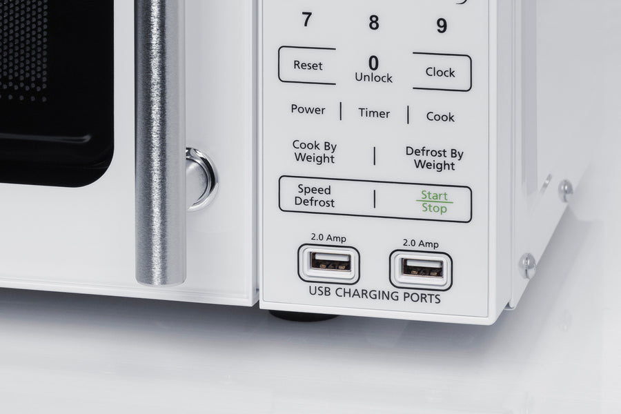 The SM904WA microwave comes in a clean white finish with an easy-grab handle in brushed stainless steel. Two USB ports are included to charge mobile devices. The microwave has a door window and digital touchpad control panel with one-touch settings for common meals, including frozen food, potatoes, pizza, and popcorn. We include two brackets that let you set the microwave on top of the refrigerator and gently secure with included adhesive strips.