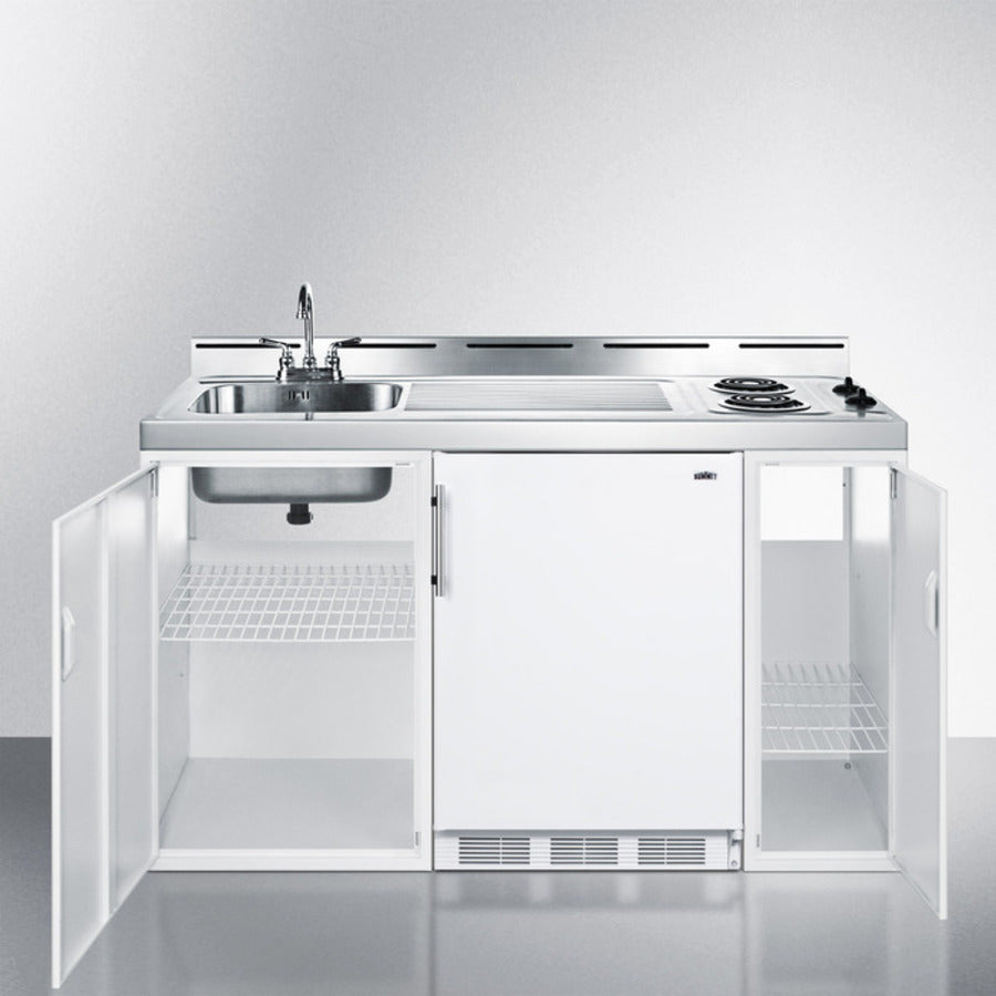 Summit C60EL 60″ Wide All-in-One Kitchenette – White Finish, 5.1 cu ft Refrigerator/Freezer + 2-Burner Coil Cooktop + Sink & Storage