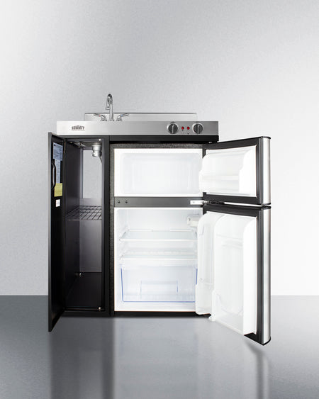 Unlike many other brands' kitchenettes, all Summit units include a refrigerator with a freezer compartment to cover all of your cold storage needs. The C30ELBK includes the two-door, ENERGY STAR certified CP34BSS, with 3.2 cu.ft. of storage space. A dual evaporator system separately cools the auto defrost refrigerator section and manual defrost freezer compartment for improved overall performance. This model also includes an adjustable glass shelf, door storage, and a crisper.