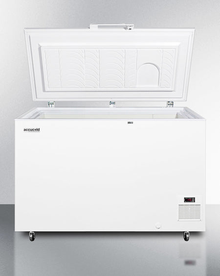This 11.1 cu.ft. chest freezer uses static manual defrost cooling to maintain constant temperature, with an externally controlled digital thermostat to ensure easy temperature monitoring. Extra thick 4 ½" thick insulation offers added efficiency and reliability. Additional features include a solid, easy-grip handle complete with factory installed lock, a sturdy set of casters, and counterbalanced hinges for comfortable loading and unloading. This unit includes a factory-installed probe hole to allow users to install their own monitoring equipment.