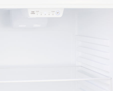 Inside, the FF1091WIM utilizes frost-free operation for easy user maintenance and boasts 10 cu.ft. of storage capacity. Two separate thermostats (touch control in the refrigeration and dial in the freezer) allow users to individually set and manage the temperature of each section. The refrigerator has two adjustable spill-proof glass shelves for easy storage. The large crisper drawer comes with a sliding gauge allowing users to control the level of humidity inside. Door storage includes full and half-width racks for storing large and small items, including one sized for gallon containers and two for cans. LED lighting in the refrigerator section provides an attractive view of the interior. The large freezer compartment includes a removable wire shelf, two full-width door racks, and a factory-installed icemaker with a removable bin for easy storage and cleanup.