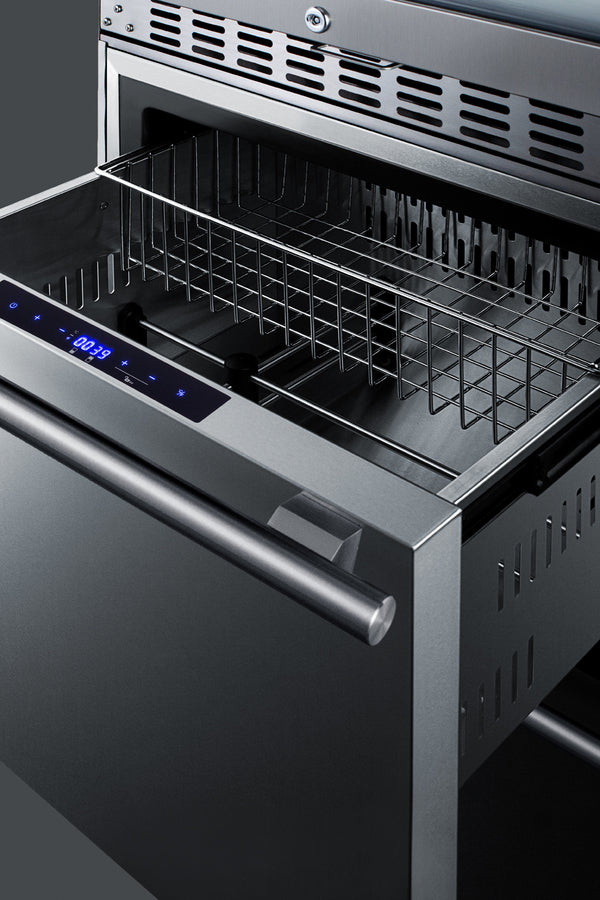 The bottom two-drawer refrigerator-freezer features complete stainless steel construction inside and out for long-lasting durability in an easy-to-clean design. Both the top drawer refrigerator and bottom drawer freezer utilize frost-free operation with fan-forced cooling, ensuring an even temperature distribution with minimum user maintenance. A digital thermostat, located atop the refrigerator drawer, makes it easy to manage the temperature, with an LED display that can be read in Celsius or Fahrenheit. Two adjustable, removable dividers make it easy to separate the drawer compartments into two (freezer) or four (refrigerator) zones to easily accommodate a variety of sizes. A full-width sliding, removable chrome basket offers added storage convenience, while white LED lighting in the refrigerator drawer makes it easy to view stored contents. A child lock will disable the digital controls after two minutes of inactivity to prevent accidental adjustments. Additional features include audible alarms for high-temperature fluctuations and open drawer alerts, while a temporary memory function helps to recover all settings in the event of power loss. The Sabbath Mode setting disables certain electrical features during periods of religious observance.