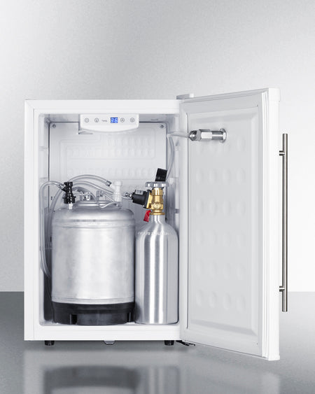 The FF31L7FRTP is a compact beer dispenser sized for tabletop use. The lightweight design allows for easy portability. The innovative front tap system allows you to pour beer through the door without an additional tower. It ships fully assembled to ensure fast setup, with all the tapping equipment you need to serve your favorite brew. The commercial grade tap kit includes a CO2 tank, regulator, stainless steel beer faucet, draft arm, stainless steel drip tray accessory, and connection tubing with a ball-lock connection. We also package a refillable 2.5 gallon mini keg for easy service.