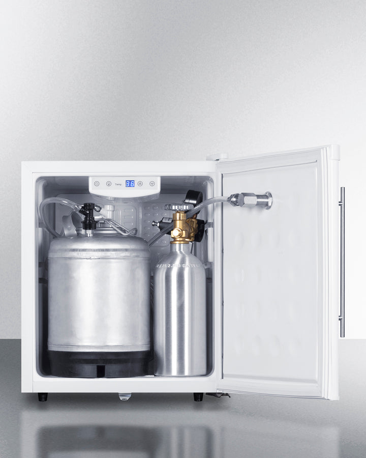 The FFAR25L7FRTP is a compact beer dispenser sized for tabletop use. The lightweight design allows for easy portability. The innovative front tap system allows you to pour beer through the door without an additional tower. It ships fully assembled to ensure fast setup, with all the tapping equipment you need to serve your favorite brew. The commercial grade tap kit includes a CO2 tank, regulator, stainless steel beer faucet, draft arm, stainless steel drip tray accessory, and connection tubing with a ball-lock connection. We also package a refillable 2.5 gallon mini keg for easy service.