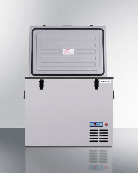 This lightweight compressor-operated unit can be plugged into the 12V DC lighter socket inside any car, truck, RV, or boat, as well as 24V sources. We also include an AC adapter to allow the SPRF56 to be plugged into a 120V electrical wall outlet. It has a gray plastic exterior for added durability, while an insulated fabric cover is included to help preserve the cool interior and protect the exterior during transport. Handles are located on each side for easier lifting as needed.