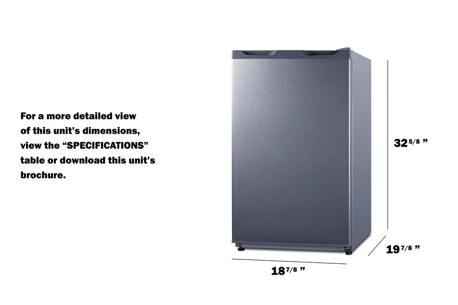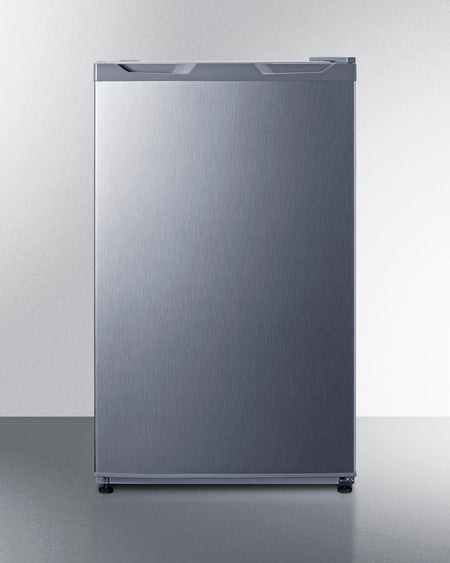 Made in Europe, model CM42PL is a freestanding refrigerator-freezer sized at just 19" wide. It has a smooth cabinet in a stainless steel look with a vertical grain. The door is is user-reversible for versatile placement.