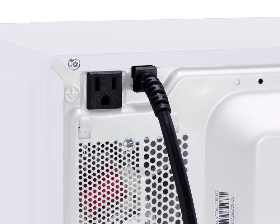 The SM904WA microwave comes in a clean white finish with an easy-grab handle in brushed stainless steel to complement the refrigerator. Two USB ports are included to charge mobile devices. The microwave has a door window and digital touchpad control panel with one-touch settings for common meals, including frozen food, potatoes, pizza, and popcorn. The display and end-of-cycle alerts can be disabled and muted as needed. We include two brackets that let you set the microwave on top of the refrigerator and gently secure with included adhesive.