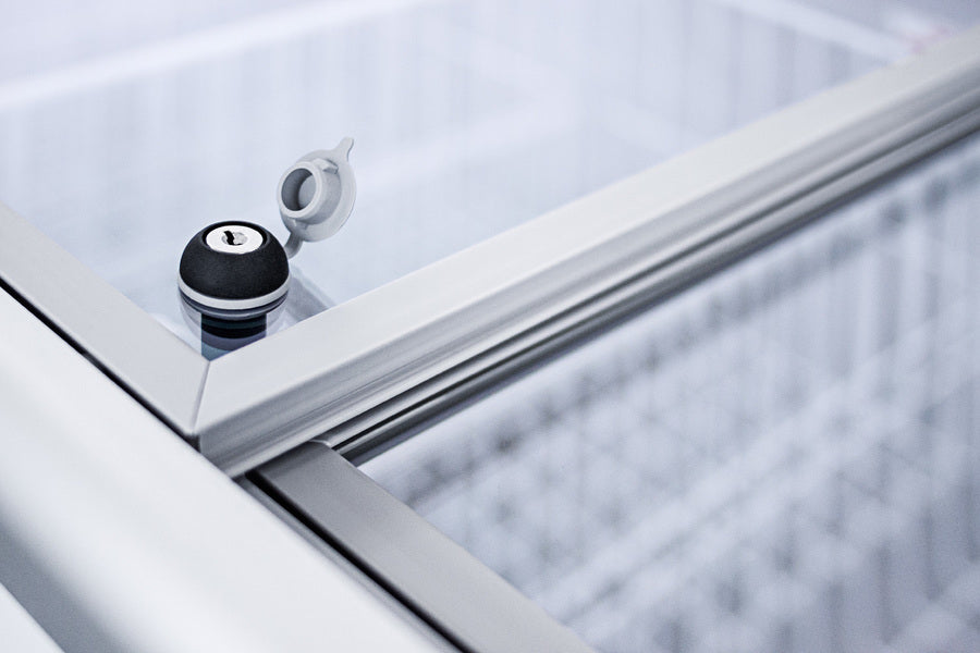 Made for us by Elcold in Denmark, the NOVA45PDC is a 53" wide flat top ice cream freezer with a clear polycarbonate sneezeguard installed on top. Two tempered glass lids on ball-bearing glides open and close smoothly to save your staff time and ensure ice cream isn't overexposed to warmer air temperature. We include a removable keyed lock to allow users the option of securing their goods. The white cabinet suits any setting, while the gray lid trim offers an added touch of clean style. Casters are included for optional installation. The digital thermostat is externally located for easy temperature management, with a wide range from -13 to 23ºF to accommodate a variety of desserts. We pre-set the unit to -4ºF.