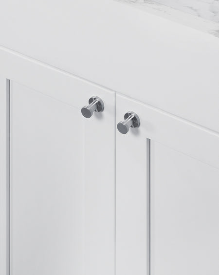 The Mesa Dry Bar is a 54" wide home dry bar in a clean white finish that ships fully assembled for easy entertaining. Sized just under 34" high, it is ideal for ADA compliant spaces. It features hardwood construction and a pre-installed countertop made from a water-resistant laminate material with a marble look. This model has a two-door storage cabinet, soft-close drawer, and wine cubby designed to hold five bottles. The cabinetry comes in a classic shaker style.