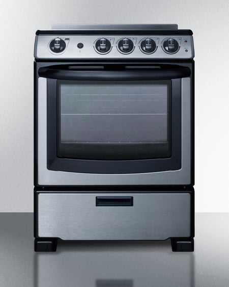 The REX2451SSRT is a 220V electric range sized at just under 24" wide. The front manifold, oven door, and lower drawer feature a stainless steel finish, with a black trimmed oven window and handle for a modern look. The versatile design includes a removable 2" high stainless steel backguard, allowing you the choice of a standard range style or a slide-in look with a flat surface that allows you to better integrate the unit with your own backsplash design. For added space savings, the REX2451SSRT features a slide-out drawer, perfect for storing your pots and pans and freeing up more kitchen space.
