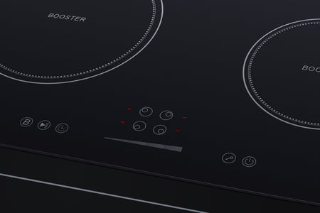 Unlike radiant heating, induction technology utilizes magnetized energy that starts inside the cookware, meaning the temperature of the actual cooktop surface does not get nearly as hot as traditional gas or electric elements. Most of the heat is retained inside your cookware, making induction technology the most efficient heating method for your kitchen. The surface is constructed from smooth EuroKera black glass to create a modern, easy-to-clean surface. The front left and rear right elements are sized at 8 1/4", ideal for boiling large pots of water or cooking with woks and other large cookware. They can function at a maximum of 3000W for up to 5 minutes when using the "booster" setting, or 2000W during regular operation. The 6 1/4" rear left and front right elements reach 2000W at the booster setting, or 1500W in normal operation. The smart burner layout helps provide plenty of room so that larger cooking vessels are spaced apart, making it easier to use all four elements without cookware colliding. Touch controls allow intuitive operation. The digital display shows which elements are in use and their power setting. Audible beeps sound when the touch controls are activated. A timer function lets you program a power level and cook time (up to 99 minutes) that can either turn the unit off when complete, or serve as a visual countdown with an audible alert when the set time has been reached. Safety features include automatic shutdown, child lock, overheat protection, and overflow protection, which will temporarily disable the power if boiling liquid touches the control panel.