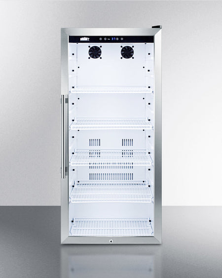 Sized with a unique 21 1/4" W x 22 1/2" D footprint, the SCR1006 offers a full 9 cu.ft. storage capacity with a full display from top to bottom. The user-reversible double pane tempered glass door includes a factory installed lock and attractive stainless steel trim. This unit has a finished white cabinet for freestanding use.
