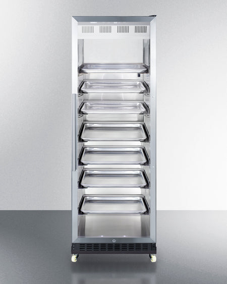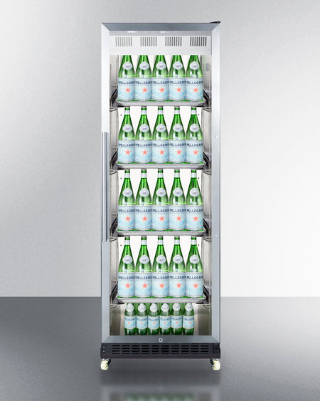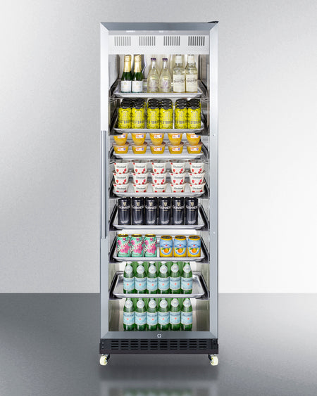 The SCR1401RICSS is an upright beverage center conveniently sized with a slim 24-inch footprint. The stainless steel trimmed glass door provides a full view of storage down to the floor, with recessed LED lighting to ensure an attractive and efficient presentation. The door comes in a right-hand door swing and features a self-closing design to help protect stored items in commercial settings where customers may not take the time to ensure a tight seal. This unit comes pre-installed on a dolly with four 3" casters for easy mobility, perfect for restaurants and bars. The dolly can also be removed and reattached as needed. A factory-installed lock offers additional security. This unit has a fully finished stainless steel cabinet and is designed for freestanding indoor use.