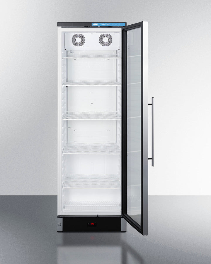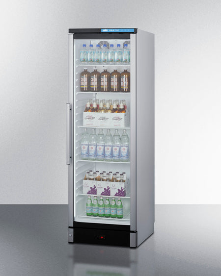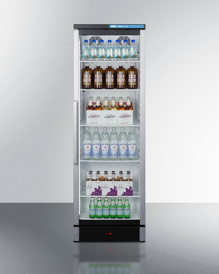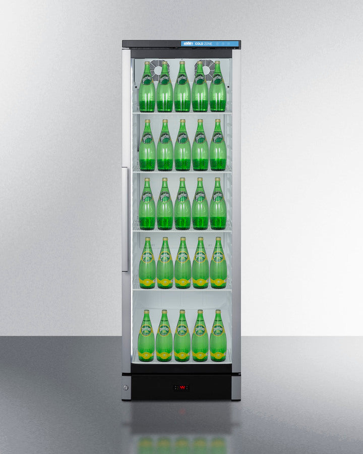 Made in Denmark, model SCR1301 is a 24" wide 12.4 cu.ft. upright beverage merchandiser sized with a space-saving 25 1/4" depth. The double pane tempered glass door includes built-in LED lighting to create an attractive and energy efficient presentation of stored items, helping to promote impulse buys. A factory-installed lock allows users to secure the door as needed. Digital controls ensure easy and intuitive operation.