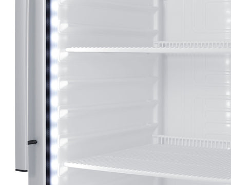 Inside, the SCR1301 features a bright white interior for full product visibility. Five adjustable wire shelves let you rearrange your storage to accommodate a variety of sizes. Each shelf has a generous 79 lb. storage tolerance. We include one additional shelf to raise items off the floor. The automatic defrost system with a cold wall interior helps to keep beverages cold and minimize user maintenance, while powerful fan-forced cooling helps to evenly distribute airflow and promote fast temperature recovery in busy commercial environments.