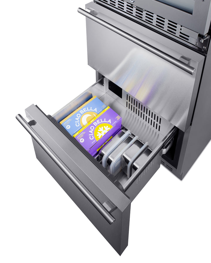 Summit brings an innovative, elegant solution to store wine and food with its combination two-zone wine cellar and two-drawer freezer - the perfect entertainment station for the home.